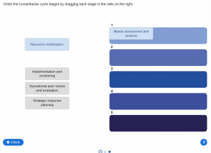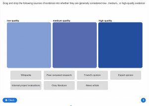 As previously outlined the course also contains custom developed H5P elements. These ungraded elements are mostly drag & drop activities that help you understand essential processes of humanitarian research. Here are a few examples: The first screenshot shows a drag & drop activity on the humanitarian cycle. In the second activity you’ll learn to differentiate between high- and low-quality evidence.