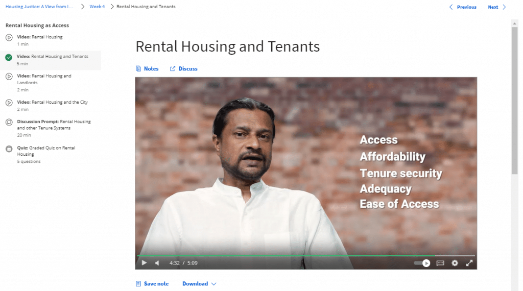 The fifth week of the course is focused on activism and contains more video content than other modules. In the introductory video you can feel that this is what the course is really about. The instructor speaks passionately about this “course on housing rights activism” and paves the floor for four inspiring activists. The activists speak about the political practice of advocating for housing justice and share their stories, strategies, campaigns, challenges and successes. Since the activist speak in their local languages, the videos contain subtitles and transcripts in English.