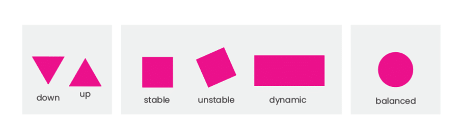 The basic building blocks of any design are shapes. Context, colour and positioning of these shapes can make a huge impact on how we perceive them. Pointy edges and lines often give off a sharp, stingy vibe, whereas round shapes appear softer and less hazardous. The same triangle can appear unstable and warning, pointing downwards, or solid and firmly grounded, pointing upwards. A square is a very balanced shape, but it is less dynamic and can feel a bit boring.