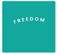 The bold font of the word “freedom” gives it an airy, breathy feel, while the arch shape of the letters adds a sense of strength. Its top position in the teal square with plenty of room around it provides visual support for the concept, and the peaceful yet lively hue of the background radiates positive energy. |